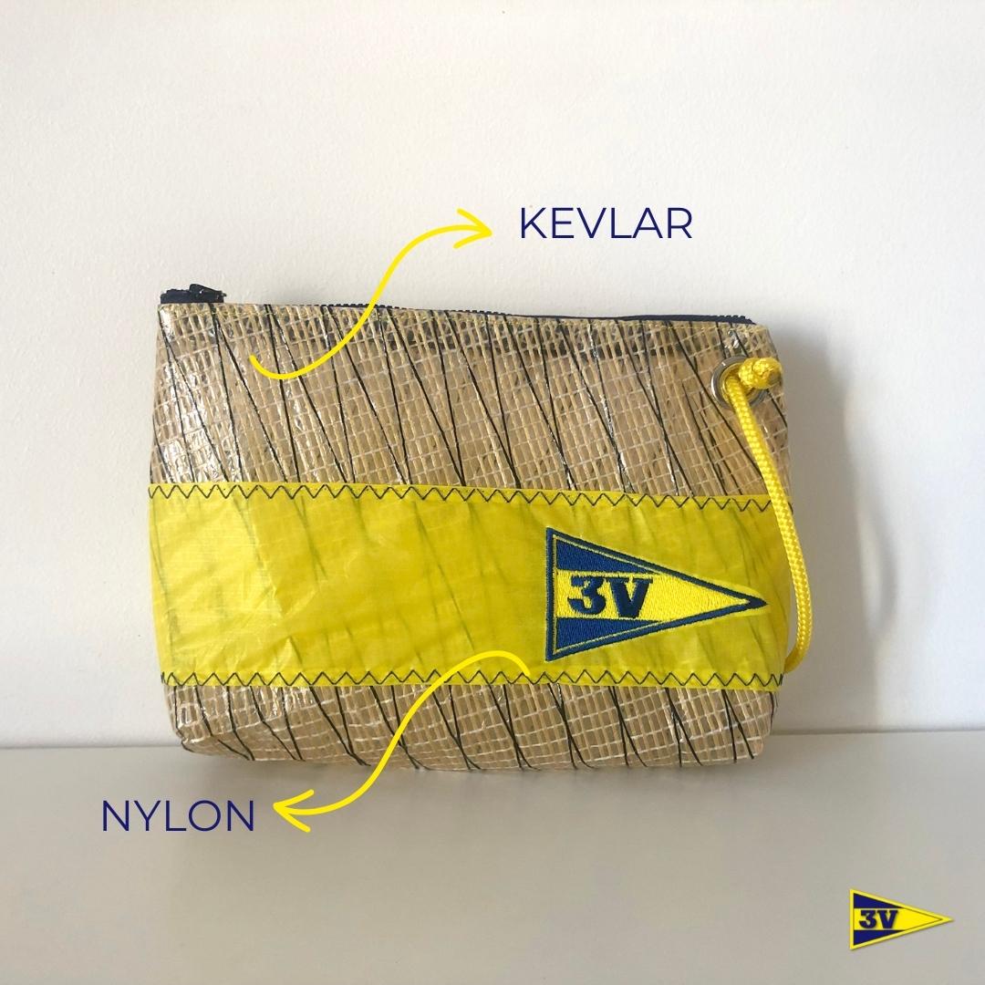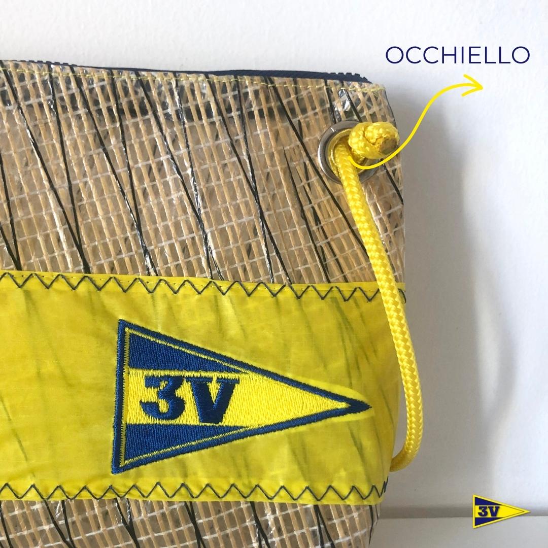 Astuccio realizzato totalmente a mano in materiale velico con cerniera lampo, decorato con fascia in nylon e occhiello con comoda cimetta per metterlo al polso.