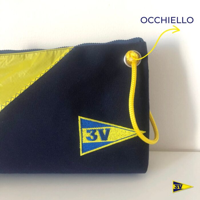 Astuccio realizzato totalmente a mano in tessuto tendalino con cerniera lampo, decorato con dettaglio in nylon e occhiello con comoda cimetta per metterlo al polso.